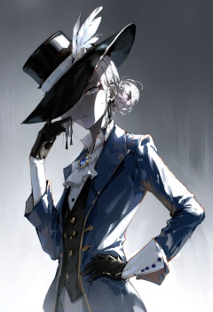 masterpiece, best quality,1girl, vertin \(reverse:1999\), solo, gloves, hat, black headwear, grey hair, grey eyes, hat over one eye, hair bun, single side bun, black gloves, shirt, looking at viewer, upper body, long sleeves, white shirt, closed mouth, one eye covered, coat, ascot, short hair, hand on own hip, collared shirt, grey background, freckles, black vest, grey skin, jewelry, kodona, simple background, elbow gloves, e.g.o \(project moon\), blue coat, earrings, expressionless, colored skin, bow, hat feather, top hat, white bow, vest, blue brooch, blue pupils <lora:DInoballXLlokr8f-000185:0.95>