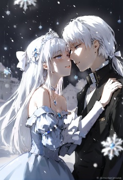masterpiece, best quality,1girl, 1boy, dress, crystal, long hair, blue eyes, white hair, tiara, bare shoulders, white dress, snowflakes, gem, long sleeves, off shoulder, jewelry, off-shoulder dress, bangs, collarbone, puffy sleeves, white bow, sparkle, tears, parted lips, looking at another, 背景, snowman, smile, necklace, juliet sleeves, bow, cross patty, snowing, blue gemstone, blush, cross, twitter username, hair bow <lora:DInoballXLlokr8f-000185:0.95>