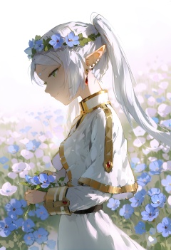 masterpiece, best quality,1girl, frieren, solo, elf, jewelry, earrings, pointy ears, twintails, capelet, long hair, green eyes, holding, flower, holding flower, long sleeves, from side, white capelet, white hair, profile, closed mouth, dress, smile, head wreath, upper body, white background, very long hair, flower field, looking up, field, nemophila \(flower\), parted bangs, half-closed eyes, white dress, outdoors <lora:DInoballXLlokr8f-000185:0.95>