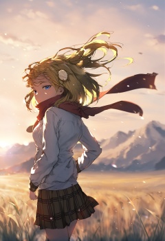 masterpiece, best quality,1girl, watson amelia, solo, blue eyes, blonde hair, skirt, looking at viewer, virtual youtuber, field, plaid skirt, scarf, outdoors, floating hair, plaid, grass, shirt, white shirt, blurry, wind, red scarf, sky, long sleeves, looking back, mountainous horizon, blurry background, from behind, hair ornament, nature, hands up, closed mouth, standing, yellow sky, sunset, medium hair, yellow scarf <lora:DInoballXLlokr8f-000185:0.95>