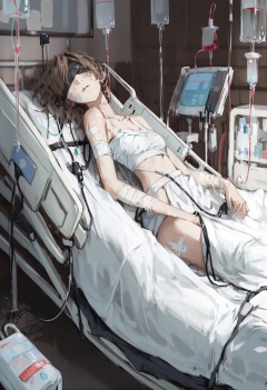 masterpiece, best quality,1girl, intravenous drip, hospital bed, solo, blood bag, hospital, lying, on back, bed, bandages, bed sheet, bandaid, cast, bandaged neck, indoors, parted lips, bandaged head, black eyes, looking at viewer, bandaid on arm, blood on face, iv stand, blood, bandaged leg, bandaid on face, bandage over one eye, brown hair, infirmary, bandaid on cheek, short hair, cast writing, bob cut, knees up, on bed, bandaged chest, feet out of frame <lora:DInoballXLlokr8f-000185:0.95>