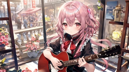 (best quality),(masterpiece),((beautiful:0.75) cute girl:0.75),[clear and clean] pixiv (illustration),gotou hitori,black shirt,concert,holding instrument,guitar,pink long hair,hair ornament,cube hair ornament,hair between eyes,bangs,blue eyes, concept art