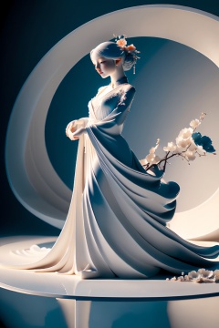 shouban,<lora:手办_v1.0:0.8>,1girl,in the strange landscape of the dream garden,an explorer wearing a flowing long dress,handheld compass,coincidentally observing a huge talking flower,surrounded by fish swimming upstream and flying flowers,her eyes sparkled with curiosity about the unknown,
