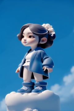 shouban,<lora:手办_v1.0:0.8>,1girl,solo,long_sleeves,standing,jacket,monochrome,boots,outdoors,sky,day,cloud,blue sky,coat,luminescence,bird,cloudy sky,magnificent_architecture,scenery,blue theme,dark,wide angle,