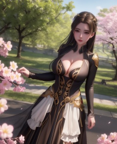 <lora:548-DA-师兄啊师克-碧霄:0.8>(,1girl, ,best quality, ),looking at viewer,  ultra detailed background,ultra realistic 8k cg,ultra detailed 8k cg,masterpiece,upper body,  (( , )),, ,science fiction,mole, ultra realistic 8k cg, ,    ,outdoors, sun,sunlight, cherry blossoms,      (cleavage), (),