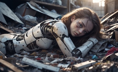 Abandoned AI-girlfriend, discarded cyborg girl, lying partially covered on a heap of trash, sad empty stare,  highly detailed, strong contrast, intricate details, volumetric light, 16k HDRI,  lot of details, high quality,  dramatic atmosphere, atmospheric perspective, subsurface scattering, transparency,  analog style, film photography, sharp focus, soft focus, cinematic vibrant lighting, heavy shadow, perfect face, damaged, broken, rusty white carapace parts with dirty cracks