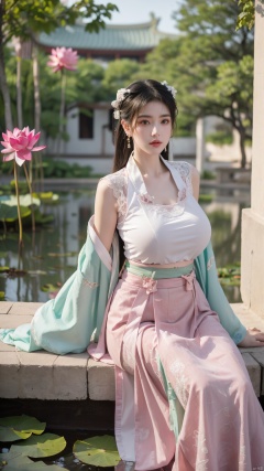 (((black hair))),(Sitting on the lotus pond porch:1.49) ,(A pond full of pink lotus flowers:1.5),close up of 1girl,Hairpins,hair ornament,hair wings,slim,narrow waist,perfect eyes,beautiful perfect face,pleasant smile,perfect female figure,detailed skin,charming,alluring,seductive,erotic,enchanting,delicate pattern,detailed complex and rich exquisite clothing detail,delicate intricate fabrics,