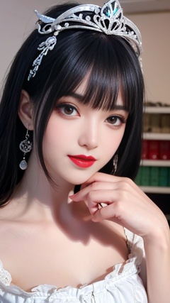 1girl, black_hair, crown, dress, earrings, eyelashes, jewelry, lips, lipstick, makeup, red_lips, solo