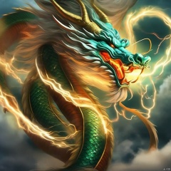 Solo, open mouth, horns, teeth, no one, glow, fangs, claws, dragon, oriental dragon, cloud, lightning