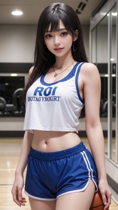 1girl,basketball,solo,white shorts,long hair,brown hair,basketball uniform,smile,shorts,jewelry,sportswear,indoors,necklace,looking at viewer,gym,holding,brown eyes,bangs,shirt,standing,blurry,lips,midriff,cowboy shot,white shirt,**** top,sleeveless,ball,holding ball,blurry background,teeth,realistic,