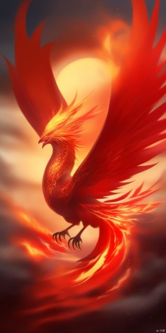 Alone, mouth open, horns, teeth, no one, glow, fangs, claws, clouds, lightning, scarlet birds, flame wings, flames