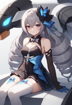 score_9,score_8_up,score_7_up,<lora:benghua3_pony:1>,1girl,bronya_zaychik_\(herrscher_of_reason\),solo,sitting,blush,grey_hair,very_long_hair,medium_breasts,cleavage,earrings,depth_of_field,highres,animal,bare_shoulders,black_dress,black_flower,black_gloves,blue_butterfly,blue_ribbon,blurry_background,closed_mouth,commentary_request,elbow_gloves,gem,glint,glowing_eye,hair_between_eyes,hair_flower,hair_ribbon,high_heel_boots,looking_at_viewer,mecha,photoshop_\(medium\),pleated_dress,project_bunny,purple_eyes,sleeveless_dress,thigh_boots,twin_drills,white_footwear,white_thighhighs,