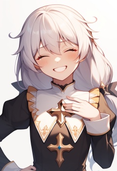 score_9,score_8_up,score_7_up,<lora:benghua3_pony:1>,1girl,theresa_apocalypse_\(valkyrie_pledge\),nun,solo,cowboy_shot,upper_body,blush,grin,long_hair,white_hair,absurdres,highres,:d,black_dress,closed_eyes,commentary_request,hair_between_eyes,hand_on_own_chest,hand_on_own_hip,long_sleeves,photoshop_\(medium\),simple_background,tearing_up,white_background,
