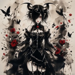 (ink-style,ink_wash_painting), (masterpiece),(best quality), Athreee, 1girl, wings, butterfly, thighhighs, horns, solo, bug, black hair, detached sleeves, red eyes, looking at viewer, demon wings, hair over one eye, dress, lolita fashion, gothic lolita, breasts, flower, demon horns, black thighhighs, gothic, hair ornament, claw ring, medium breasts, short hair, demon girl, long sleeves, black dress