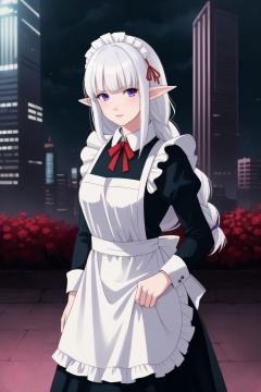 realistic,Nephelia,1girl,pointy ears,blue eyes,very long hair,white hair,elf,apron,maid,collar,braid,dress,long sleeves,frills,blunt bangs,hair ribbon,<lora:lbc_Nephelia_v1.0:0.8>,mechanical prosthesis,mecha coverage,emerging dark purple across with white hair,fluorescent purple,cool movement,rose red eyes,beatiful detailed cyberpunk city, hd semirealistic anime cg concept art digital painting,