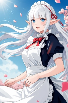 realistic,Nephelia,1girl,pointy ears,blue eyes,very long hair,white hair,elf,maid,collar,braid,blunt bangs,hair ribbon,<lora:lbc_Nephelia_v1.0:0.8>,((breeze)), flying splashes, flying petals, wind,
