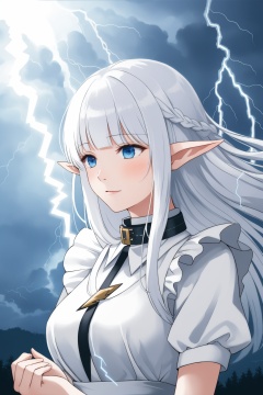 realistic,Nephelia,1girl,pointy ears,blue eyes,very long hair,white hair,elf,maid,collar,braid,blunt bangs,hair ribbon,<lora:lbc_Nephelia_v1.0:0.8>,((breeze)), flying splashes, flying petals, wind,(detailed light), ((lightning in hand)),lightning surrounds,(((lightning chain))),(sunlight),(angel),dynamic angle, floating, wing, halo, floating white silk,(Holy Light),silver stars,