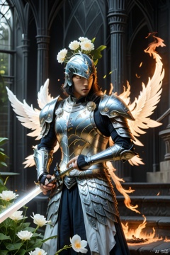 haha,solo, 1boy, holding, standing, weapon, flower, male focus, wings, sword, indoors, holding weapon, armor, glowing, holding sword, helmet, fire, white flower, shoulder armor, gauntlets, breastplate, stairs, full armor