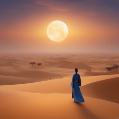 desert_sky,outdoors,sky,moon,scenery,desert,wide shot,animal, landscape, tang_hanfu, FANTASY