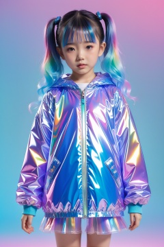 5-year-old girl,transparent color PVC clothing,transparent color vinyl clothing,prismatic,holographic,chromatic aberration,fashion illustration,masterpiece,girl with harajuku fashion,looking at viewer,8k,ultra detailed,pixiv,solid background,colorful gradient hair,<lora:LEISHE_20240429220547:0.8>,