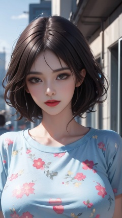 1girl, 3d, breasts, brown_eyes, brown_hair, building, floral_print, lips, looking_at_viewer, medium_breasts, realistic, shirt, short_sleeves, solo, upper_body
