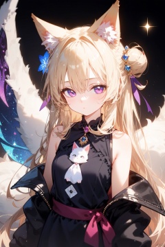 medium-B,kemomimi-chan_(naga_u),1girl, animal_ear_fluff, animal_ears, black_background, blonde_hair, blush, commentary_request, dark_side_of_the_moon, fox_ears, hair_between_eyes, hair_bun, hair_ornament, kemomimi-chan_\(naga_u\), looking_at_viewer, naga_u, original, pink_floyd, purple_eyes, rainbow, simple_background, solo, sparkle, v-shaped_eyebrows