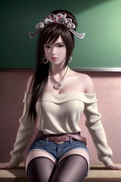 ((HRD, HUD, 8K)),((masterpiece, best quality)), highly detailed, soft light,1girl, solo, black hair, long hair, ponytail, hair ornament, tiara, black eyes, brown eyes, lips,jewelry, earrings, (off-shoulder sweater:1.2), denim shorts, black pantyhose, blurry background, classroom, chalkboard, sitting, cowboy shot, looking at viewer, <lora:20240430-1714439888539:0.7>