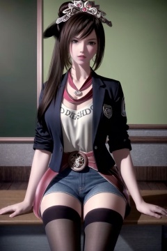 ((HRD, HUD, 8K)),((masterpiece, best quality)), highly detailed, soft light,1girl, solo, black hair, long hair, ponytail, hair ornament, tiara, black eyes, brown eyes, lips,(t-shirt:1.2), (blazer:1.2), denim shorts, black pantyhose, blurry background, classroom, chalkboard, sitting, cowboy shot, looking at viewer, <lora:20240430-1714439888539:0.7>