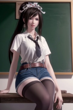 ((HRD, HUD, 8K)),((masterpiece, best quality)), highly detailed, soft light,1girl, solo, black hair, long hair, ponytail, hair ornament, tiara, black eyes, brown eyes, lips,(white shirt:1.2), necktie, denim shorts, black pantyhose,blurry background, classroom, chalkboard, sitting, cowboy shot, looking at viewer, <lora:20240430-1714439888539:0.7>