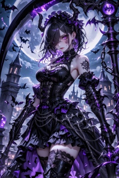 masterpiece, best quality, 1girl, solo, scythe, tattoo, holding, thighhighs, chain, purple eyes, holding weapon, holding scythe, looking at viewer, earrings, moon, weapon, breasts, armor, gauntlets, jewelry, bat \(animal\), bare shoulders, corset, black hair, gothic lolita, cowboy shot, dress, hair between eyes, sleeveless, facial tattoo, frills, black thighhighs, medium breasts, bangs, skirt, hair over one eye, lolita fashion, closed mouth, horns, facial mark, night, boots