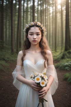 <lora:hongxiu_20240428204231-000006:0.5>,Best quality,masterpiece,featuring 1 young girl,Holding these flowers in both hands,mid-length tousled hair flowing in the breeze,intense gaze,standing against the ethereal forest backdrop,((poakl)),1 girl,qzclothing,Super perspective,wide shot,zodiac,qzidol,