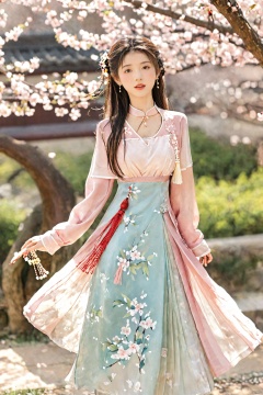 A girl,skirt,jewelry,long_hair,necklace,earrings,perfect body,standing,large breasts,looking at viewer,chinese clothes,china dress,hanfu,cherry_blossoms,in spring,sunny,sunny,wind,cloud,bright,