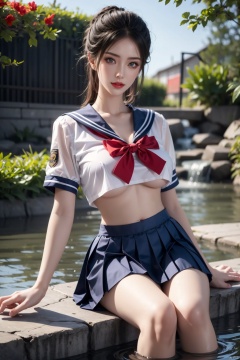 1girl, solo, skirt, breasts, school uniform, underboob, sitting, serafuku, pleated skirt, crop top, outdoors, blue skirt, looking at viewer, crop top overhang, sailor collar, blurry background, bow, blurry, short sleeves, black hair, day, blue eyes, shirt, red bow, white shirt, large breasts, bowtie, no bra, blue sailor collar, water, lips, forehead, red lips, brown hair, soaking feet, parted lips, JK<lora:EMS-361301-EMS:0.800000>