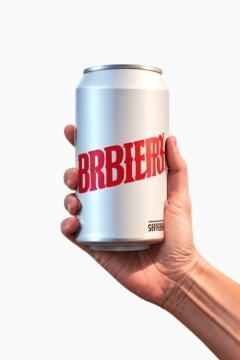 a hand holding a white can of beer., White background