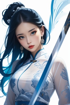 lbc girl, a woman with long hair holding a sword, solo, long hair, looking at viewer, black hair, hair ornament, white background, dress, holding, jewelry, closed mouth, blue hair, upper body, weapon, earrings, sky, sword, holding weapon, white dress, blue sky, facial mark, expressionless, holding sword, forehead mark