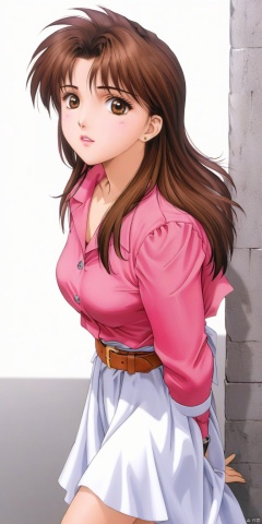 1 girl, solo, huge chest, medium hair, watch, pink shirt, belt, white dress, open clothes, brown hair, brown eyes, looking up