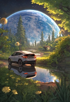 masterpiece, best quality,1girl, black background, solo, star \(sky\), space, reflection, long hair, ground vehicle, scenery, outdoors, motor vehicle, blurry foreground, car, plant, blurry, vehicle focus, grass, sunlight, depth of field, day, tree, leaf, overgrown, nature, forest, planet, dirt, sky, starry sky, grasslands, branch, facing away, military, flower, earth \(planet\), black hair, dandelion <lora:さばみそ太郎XLlokr8f-000097:0.95>