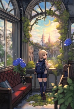 masterpiece, best quality,multiple girls, 2girls, staff, long hair, brown hair, moon, brown eyes, crescent moon, cloud, blue hair, thighhighs, open mouth, overgrown, solo, sitting, plant, scenery, ruins, indoors, sunlight, shorts, couch, blurry foreground, light rays, blurry, vines, wide shot, depth of field, window, moss, day, barefoot, chair, tree, solo, snow, outdoors, umbrella, snowing, building, scenery, winter, bag, holding, power lines, holding umbrella, backpack, utility pole, standing, coat, sky, day, wide shot, school uniform, long sleeves, house, lens flare, shoes, unworn shoes, nature, blue flower, shirt, blunt bangs, blonde hair, necktie, smile, flower, skirt, looking to the side, blue eyes <lora:さばみそ太郎XLlokr8f-000097:0.95>