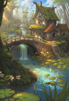 masterpiece, best quality, scenery, ruins, outdoors, overgrown, water, day, tree, nature, moss, sunlight, sky, forest, lily pad, light rays, sunbeam, post-apocalypse, bridge, artist logo, no humans, mushroom world, mushroom, forest, sign, diluc \(object\), mushroom house, scenery, reflection, cloud, waterfall, railing, lily pad on colored, blue sky <lora:さばみそ太郎XLlokr8f-000097:0.95>