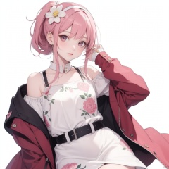 1girl, solo, long hair, looking at viewer, bangs, skirt, simple background, hair ornament, white background, dress, closed mouth, jacket, ponytail, pink hair, flower, hairband, sleeveless, belt, hair flower, off shoulder, white dress, arm up, sleeves past wrists, v, makeup, floral print, white flower, red lips, pink jacket
