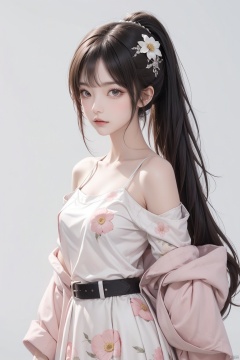 1girl, solo, long hair, looking at viewer, bangs, skirt, simple background, hair ornament, white background, dress, closed mouth, jacket, ponytail, pink hair, flower, hairband, sleeveless, belt, hair flower, off shoulder, white dress, arm up, sleeves past wrists, v, makeup, floral print, white flower, red lips, pink jacket
