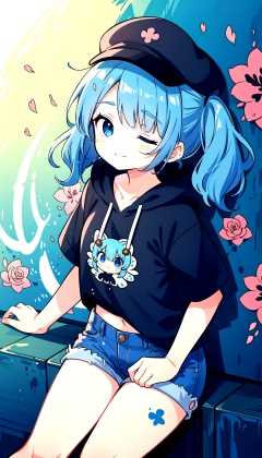 Illustration,Cover,enigmatic figure,draped in translucent fabric,crystals adorning hair,dreamlike swirl,pastel hues,soft light,evoking calm serenity and elusive beauty,Non-representational,colors and shapes,expression of feelings,imaginative,highly detailed,hair_ornament,headwear,serious,vigilant,badass,cold,looking_away,evil_smile,((extremely glossy)),blue hair,blue hair,black,red,cowboy shot,hair over one eye,expressionless,soft smile,(satoshi kon:1.2),wavy hair,mature woman,slender,dress,Gustav Klimt,twintail,black hair,gothic dress,studs,1 girl,looking at viewer,(finely best quality illustration:1.2),masterpiece,(kawaii girl:1),solo,1girl is in front of wall with (graffiti of black and blue rose:1.1),(plump:0.4),[small breasts:medium breasts:0.3],collarbone,detailed eyes,blue eyes,(half-closed eyes:0.6),half-closed mouth,soft smile,(green:1.1) hair,black cap,Wear (front-opening:1.2) hoodie over t-shirt,\(tie up the hem of one's T-shirt\),white simple t-shirt,(low-rise:1.4) and low-leg (denim short shorts:1.2),(stooping forward:1.3),close-up,midriff peak,