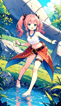 (masterpiece, best quality, ultra-detailed, highres),perfect face,sidelighting,lustrous skin,(bloom),(shine),lighting,ray tracing,outdoor,depth_of_field,very detailed background,highly detailed background,Masterpiece,Ultra detailed,great composition,Dynamic angle,[Bottle bottom],(wide shot),extremely delicate and beautiful,(Highest picture quality),(Master's work),(Detailed eyes description),(Detailed face description),(fantasy),depth of field,solo,Beautiful girl,extreme light and shadow,masterpiece,rich in detail,(fine features),(highest quality),(masterpiece),(beautiful) detailed girl,(straight-on),full body,(extremely detailed CG unity 8k wallpaper),(masterpiece),(best quality),(ultra-detailed),(best illustration),Volumetric Lighting,Best Shadows,Shallow,(masterpiece, best quality, ultra-detailed, highres),sidelighting,(bloom),(shine),lighting,ray tracing,evil_smile,close up,((extremely glossy)),1girl,solo,vanille,twintails,green eyes,tribal jewelry,necklace,bracelet,beads,pink crop top,belt,sarong,clothes around waist,waist up,rock formations,blue sky,field,landscape,cloud trails,looking at you,happy,open mouth,medium breasts,((extremely glossy)),((glossy skin)),((soft reflective skin)),((reflections)),wide shot,