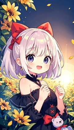 (masterpiece, best quality, ultra-detailed, highres),perfect face,sidelighting,lustrous skin,(bloom),(shine),lighting,ray tracing,outdoor,depth_of_field,very detailed background,highly detailed background,Masterpiece,Ultra detailed,great composition,Dynamic angle,[Bottle bottom],(wide shot),extremely delicate and beautiful,(Highest picture quality),(Master's work),(Detailed eyes description),(Detailed face description),(fantasy),depth of field,solo,Beautiful girl,extreme light and shadow,masterpiece,rich in detail,(fine features),(highest quality),(masterpiece),(beautiful) detailed girl,(straight-on),full body,(flower field:1.1),flower petals falling,(summer:1.2),happy,smile,(extremely detailed CG unity 8k wallpaper),(masterpiece),(best quality),(ultra-detailed),(best illustration),(best shadow),seductive,sunset,sunshine,sun,perfect lighting,perfect anatomy,shy,date,beautiful,twintails,hair bow,earrings,bare shoulders,black dress,corset,detached sleeves,:D,furrowed brow,magic circle,black background,looking at viewer,upper body,hands to hips,holding teddy bear,stuffed animal,((extremely glossy)),((glossy skin)),((soft reflective skin)),((reflections)),wide shot,
