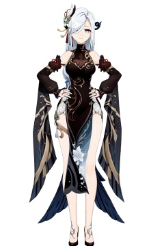 8k, best quality, masterpiece, (ultra-detailed:1.1), (high detailed skin), (full body), white background, standing, looking at viewer, (solo), hand on hip, <lora:ganshenxian-A3-Tanger-000010:0.8>, shenhe \(genshin impact\), Shenhe's new year's clothes, 1girl, black dress, hair over one eye, long hair, full body, hair ornament, breasts, detached sleeves, chinese clothes, looking at viewer, (white background, simple background), (beautiful_face), ((intricate_detail)), clear face, ((finely_detailed)), fine_fabric_emphasis, ((glossy)), full_shot,