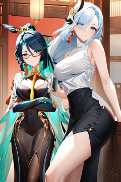 8k, best quality, masterpiece, (ultra-detailed:1.1), (high detailed skin), <lora:ganshenxian-A3-Tanger-000010:0.8>, 2girls, Xianyun \(genshin impact\), Xianyun's def clothes, shenhe \(genshin impact\),shenhe's casual clothes, long hair, skirt, glasses, breasts, blue eyes,