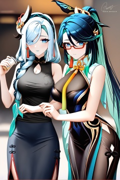 8k, best quality, masterpiece, (ultra-detailed:1.1), (high detailed skin), <lora:ganshenxian-A3-Tanger-000006:0.8>, 2girls, Xianyun \(genshin impact\), Xianyun's def clothes, shenhe \(genshin impact\), shenhe's casual clothes, long hair, skirt, glasses, breasts, blue eyes,