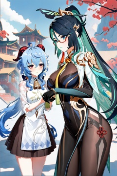 8k, best quality, masterpiece, (ultra-detailed:1.1), (high detailed skin), <lora:ganshenxian-A3-Tanger-000010:0.7>, 2girls, Ganyu's casual clothes, ganyu \(genshin impact\), Xianyun \(genshin impact\), Xianyun's def clothes,