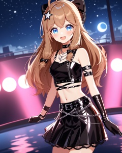 cinematic film still very aesthetic,aesthetic,amazing quality,best quality,hight,hight quality,masterpiece,highres BREAKbeautiful eyes,luminous eyes,gentle eyes,oil painting,((classicism)),1girl,solo,cowboy shot,disdain,Volumetric Lighting,Cinematic Lighting,motion_blur,depth of field,:d,hands behind,glow,night,stars_(sky),moon,water,glass floor,flowers around,vision,idolmaster,dynamic angles,Hazy light,Floodlight,falling star,↘,red style,(sea),fantasy,fantastic,dreamy,blush,from side,looking_at_viewer,upper_body,dutch angle,fisheye,from above,beautiful water,beautiful sky,stars_(sky),Light effects,Optical particle,Luminous,High brightness contrast,1girl,blue eyes,ahoge,long hair,black gloves,black choker,black pleated skirt,leather,black hair bow,black arm belt,brown hair,white star hair ornament,necklace,black crop top,midriff,black belt,chain,blurry,multicolored_background,(stage:1.2),<lora:jiaran-asoul-a3a-000008:0.6>, . shallow depth of field, vignette, highly detailed, high budget, bokeh, cinemascope, moody, epic, gorgeous, film grain, grainy