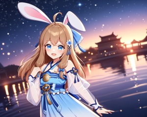 cinematic film still very aesthetic,aesthetic,amazing quality,best quality,hight,hight quality,masterpiece,highres BREAKbeautiful eyes,luminous eyes,gentle eyes,1girl,solo,cowboy shot,disdain,Volumetric Lighting,Cinematic Lighting,motion_blur,depth of field,:d,hands behind,glow,night,stars_(sky),moon,water,glass floor,flowers around,vision,idolmaster,dynamic angles,Hazy light,Floodlight,falling star,↘,red style,(sea),fantasy,fantastic,dreamy,blush,from side,looking_at_viewer,upper_body,dutch angle,fisheye,from above,beautiful water,beautiful sky,stars_(sky),Light effects,Optical particle,Luminous,High brightness contrast,1girl,rabbit ears,blue eyes,ahoge,long hair,brown hair,blue hanfu,blue hair bow,blue bow,hair ornament,see-through sleeves,detached sleeves,blue hair flower,<lora:jiaran-asoul-a3a-000008:0.6>,blurry,multicolored_background,chinese bulding, . shallow depth of field, vignette, highly detailed, high budget, bokeh, cinemascope, moody, epic, gorgeous, film grain, grainy